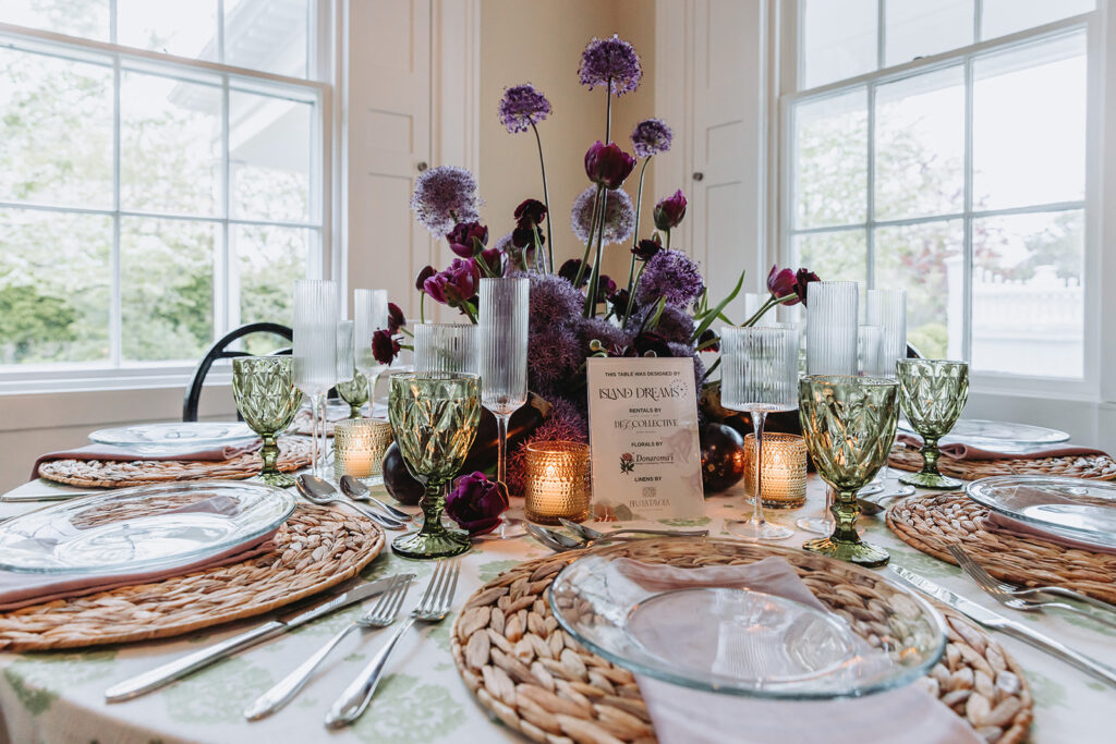 Two table displays showcase the ultimate luxury and design of planning an event on Martha’s Vineyard